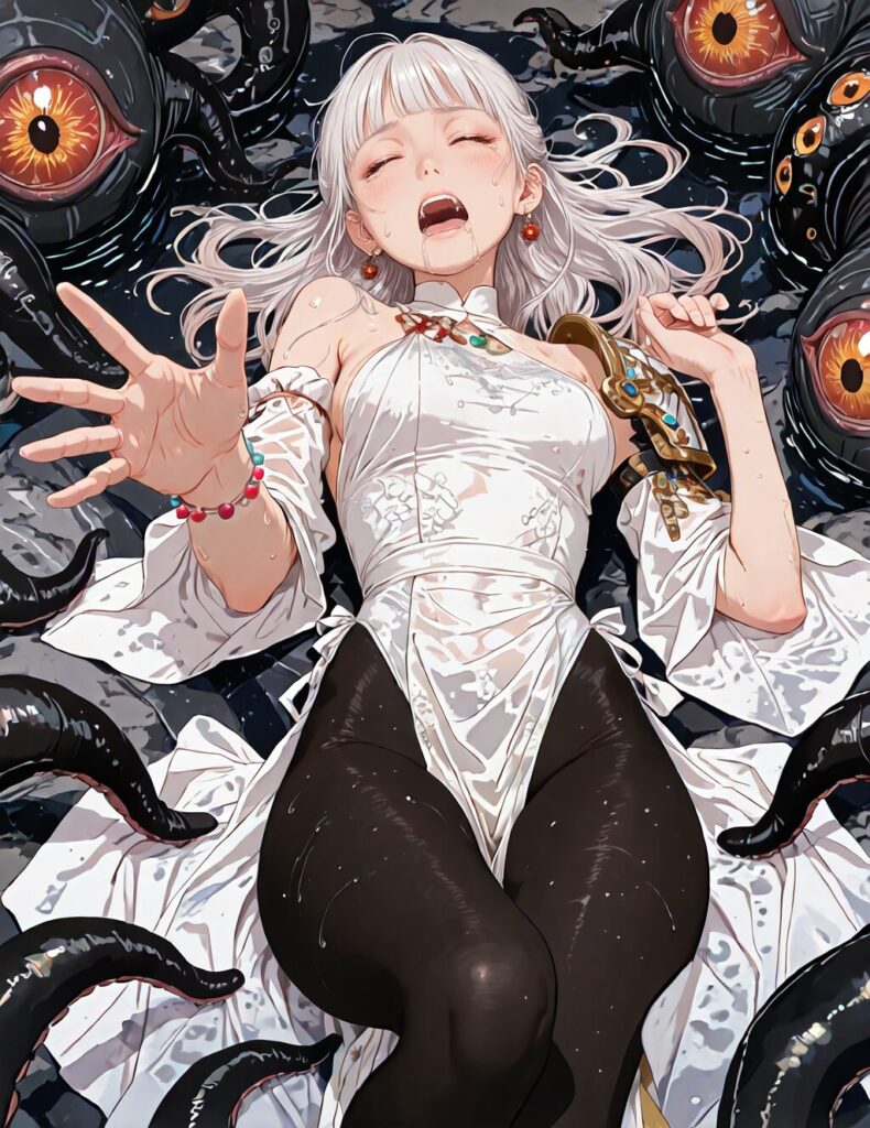 masterpiece,best quality,newest,general,solo,1girl,d_i_t,extra eyes,tentacles,monster,indoor,wet,lying, open mouth,saliva, <lora:Fixhands_anime_bdsqlsz_V1:1>,tears,panicking,gasping,reaching towards viewer,looking_at_viewer,leg grab, hair bun,half updo,white hair,long hair,blunt bangs,white eyelashes,closed eyes,grey gradient hair,earrings,jewelry,n_clothes,dress,black and white dress,bare shoulders,single pauldron,single mechanical arm,bridal gauntlets,sideboob,single glove,bead bracelet,wide sleeves,bracelet,pelvic curtain,leotard,black pantyhose,top-down_bottom-up,,<lora:draw_in_t_ilxl_v1.4:0.7>