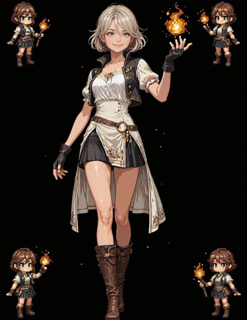 octopath_cotc_sprite, path action style, pixel art, imtdxion, 1girl, short hair, blue eyes, bangs, hair between eyes, black open coat, gloves, black mini skirt, fingerless gloves, black Cropped Jacket, white short sleeves, boots, black knee-high boots, smiling, closed mouth, runelord, 1:2 ratio, 40x80, solo, high quality pixel art, clean pixel art, sharp pixels, pixelated, square pixels, limited color palette, clean edges, black background <lora:Octopath_Traveler_Champions_Of_the_continent_-_Character_path_action_Sprite_Style:1>