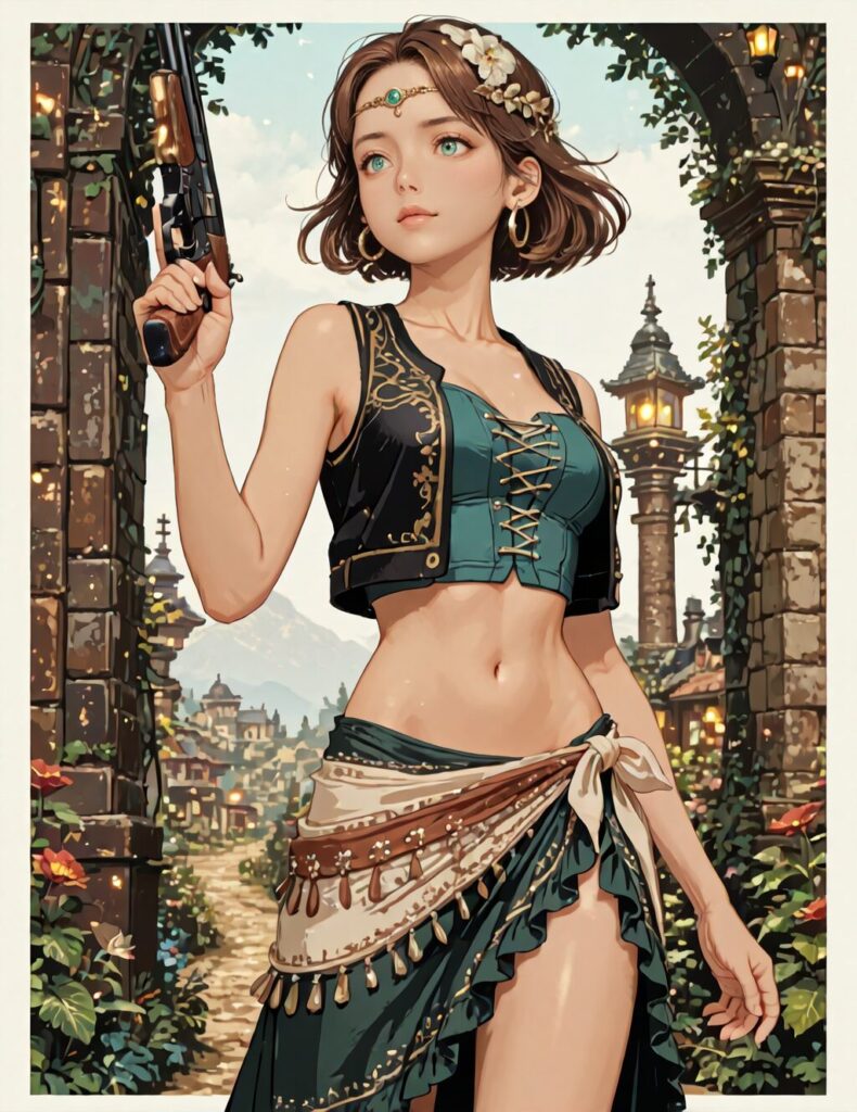 octopath_cotc_sprite, path action style, pixel art, short hair, brown hair, aqua eyes, hoop earrings, circlet, vest, cross-laced skirt, sarong <lora:Octopath_Traveler_Champions_Of_the_continent_-_Character_path_action_Sprite_Style:1.2>