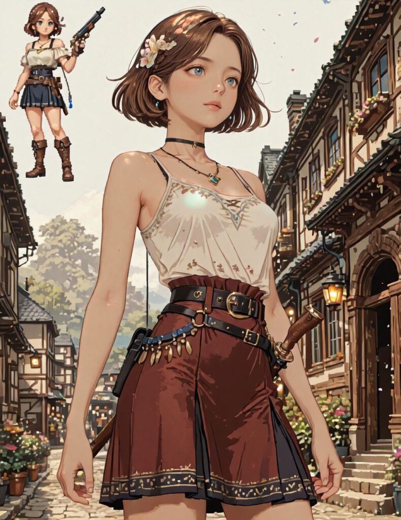 octopath_cotc_sprite, path action style, pixel art, kairi_kh1, brown hair, short hair, blue eyes, choker, necklace, tank top, belt, skirt <lora:Octopath_Traveler_Champions_Of_the_continent_-_Character_path_action_Sprite_Style:1.2>