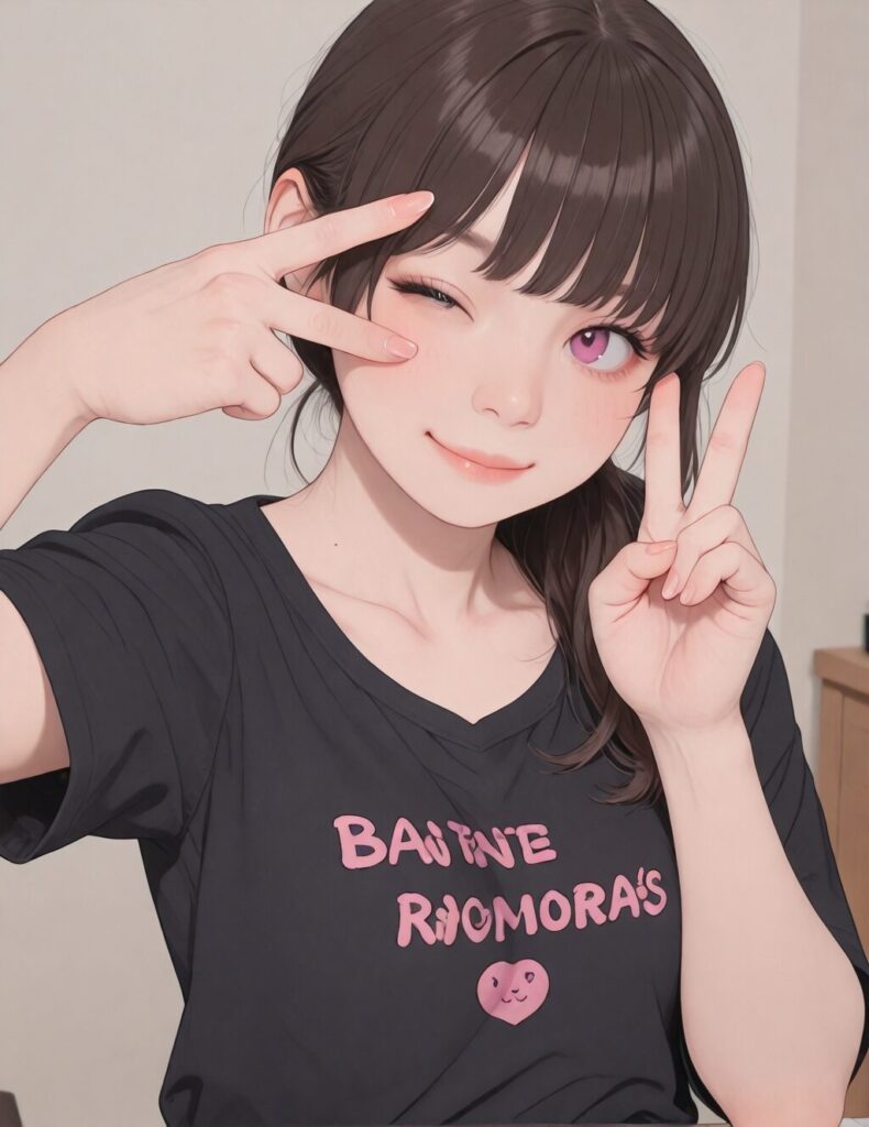 1girl, solo, selfie, v over eye, close-up face, smile, wink, pink eye, dark brown hair, black T-shirt, none,, NO_LORA
