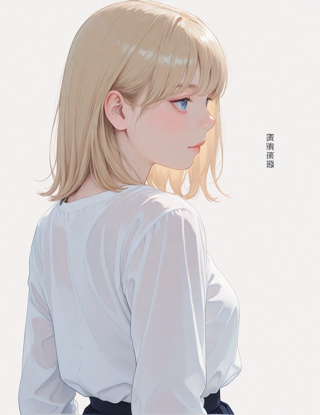 1girl, solo, profile view, blonde hair, medium hair, white shirt, long sleeves, blue eyes, simple background, NO_LORA