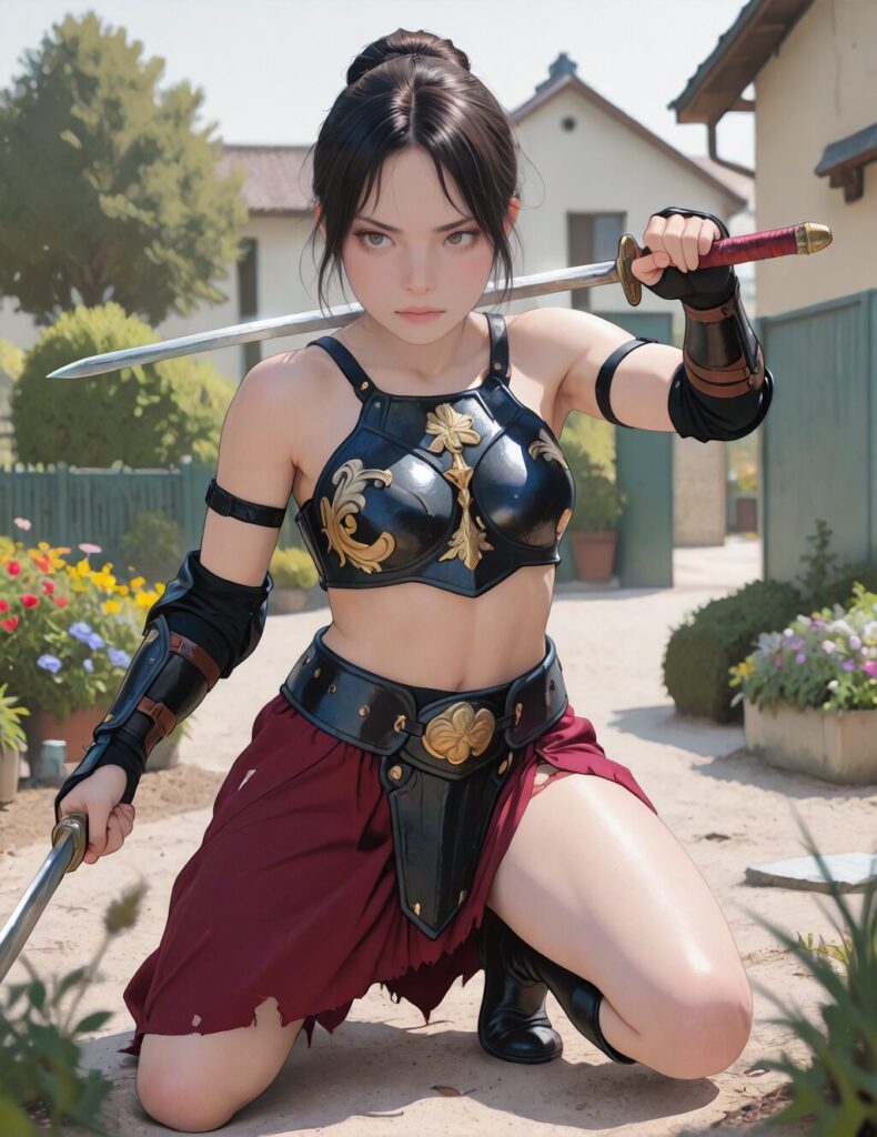 female warrior, action pose, garden, depth of field, extremely detailed , detailed background, clutter ,NO_LORA