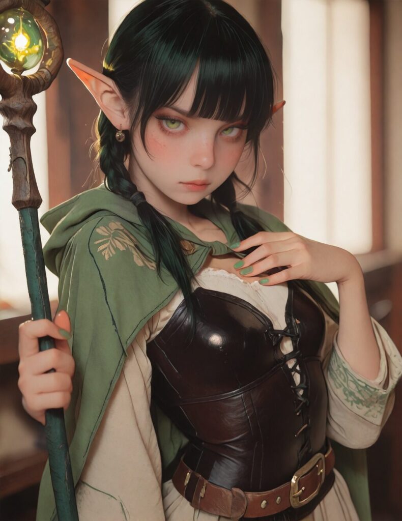 masterpiece, best quality, amazing quality, very aesthetic, newest, depth of field, (blurred background), (dramatic lighting),masterpiece, best quality, very aesthetic,8k,masterpiece, best quality,realistic, masterpiece, best quality, 8k, simple_background, 1girl, Female, tall, freckles, nerdy, freckles, tsurime eyes, tsurime, eyelashes, freckles, pouting, tsundere, long black hair, blunt bangs, twin long pigtails, long green nails, elf, elven ears, earrings, multiple peircings, multiple ear rings, small breasts, slender body, tall, cleavage, clavicle, slender upper chest, wearing a beige long sleeves tunic and dark black bodice, simple-designed black leather armor with only torso part, small pouches hang from her belt, large tome, glowing spellbook, spellbook hanging from belt, arcene sigils, glowing cute green hood cape, glowing green cute adventurers cape, long battle mage staff, green glowing energy, hand on staff, hand on chest, looking to viewer, dynamic angle, fantasy tavern background, dynamic pose, nervous , NO_LORA