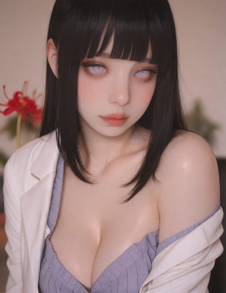 masterpiece, best quality, amazing quality, very aesthetic, newest, depth of field, (blurred background), (dramatic lighting),masterpiece, best quality, very aesthetic,8k,masterpiece, best quality,realistic, masterpiece, best quality, 8k, simple_background, mole near mouth 1girl, hyuuga hinata, purple eyes, white eyes, blunt bangs, black hair, hime cut, cleavage, plump lips, straight hair, side locks, hime cut, office uniform, white suit, one shoulder exposed, makeup, purple eyes, bewitching, seductive, bust up, BREAK Red spider lily, Moody lighting, blurry, NO_LORA