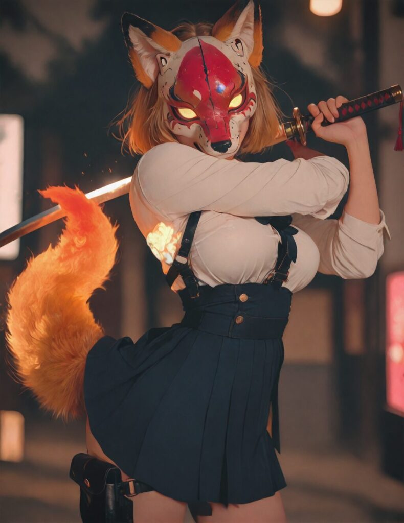 masterpiece, best quality, amazing quality, very aesthetic, newest, depth of field, (blurred background), (dramatic lighting),masterpiece, best quality, very aesthetic,8k,masterpiece, best quality,realistic, masterpiece, best quality, 8k, simple_background, (dynamic compostion:1.2), anime style, masterpiece, best quality, amazing quality, very aesthetic, absurdres, newest, 8K,HDR,absurdres, colorful, 1girl, large breasts, action pose, ultra detailed cracked fox_mask, fox fire, holding one katana, school uniform, harness, thigh pouch, glowing red fox tails, glitch art, virtual, colored shadow, geometry, local color adaptation, hdr, (chromatic aberration, polarized:1.2), , NO_LORA