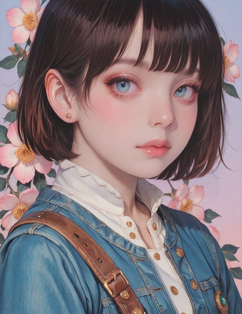 Glitchcore Baroque, The image is a portrait of a young woman's face. She has short dark hair styled in a short spiky cut with a pink flower in her hair. Her eyes are a piercing blue and her lips are a deep red. She is wearing a white collar with a gold buckle and a blue and gold jacket with a high collar. The background is black with a textured pattern that gives the image a futuristic and edgy feel. The overall color scheme of the image is predominantly blue gold and pink with some hints of purple and green. The image has a dreamy and surreal feel to it., solo, blue eyes, 1girl, portrait, looking at viewer, brown hair, short hair, realistic, lips, closed mouth<lora:detailed skin style illustriousXL v1:0.8> , NO_LORA,