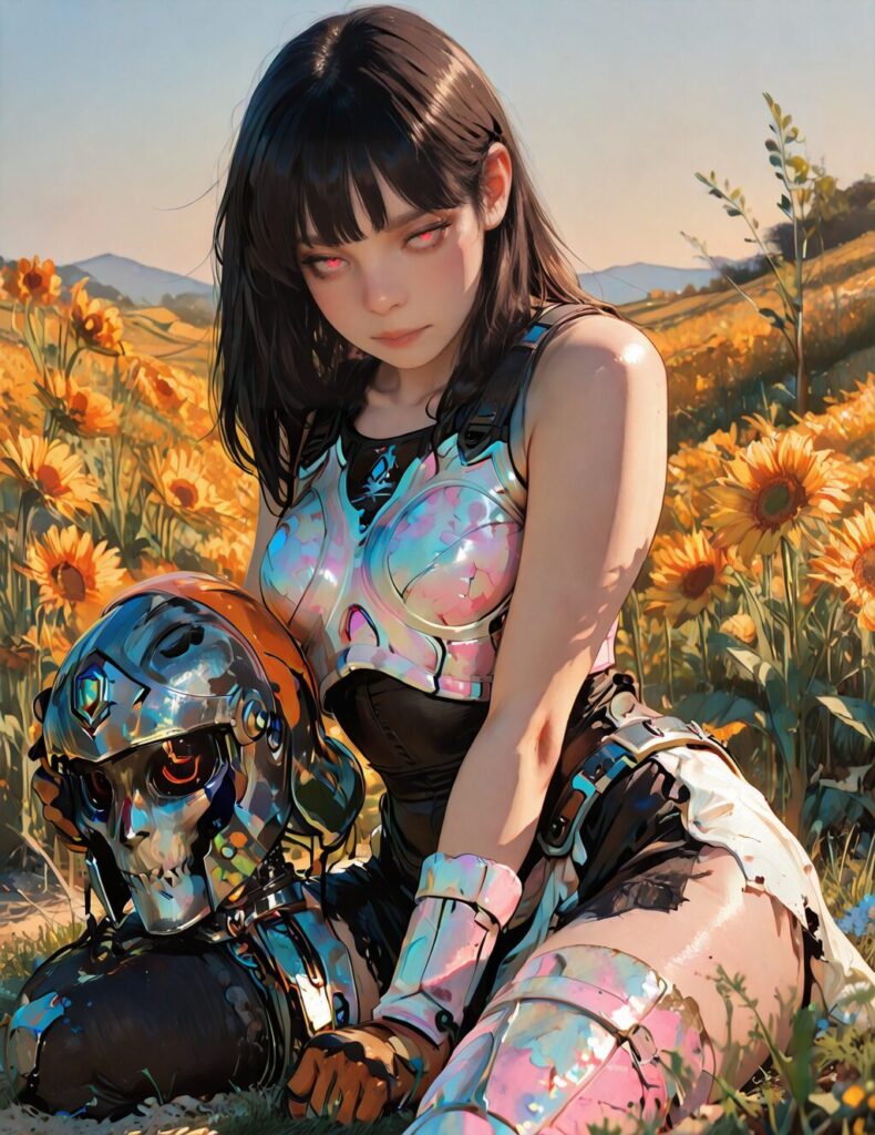 masterpiece, high_quality, highres, sharp_focus, detailed_eyes, EmoWaterDaal, 1cybernetic knight, removing helmet, exhausted stance, wildflower field, painterly watercolor, pastel armor dissolve, warm rim lighting, soft shadows, quiet vulnerability<lora:detailed skin style illustriousXL v1:0.8> , NO_LORA