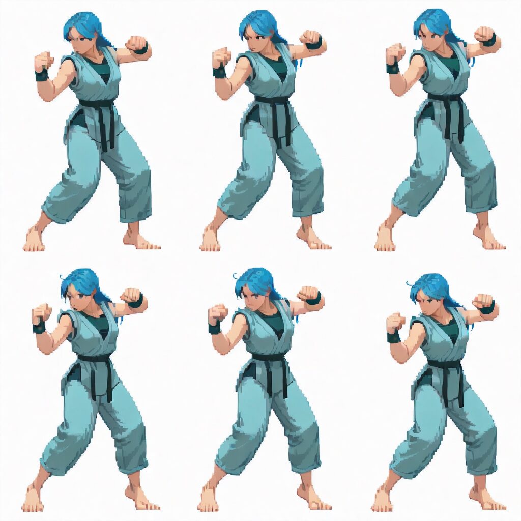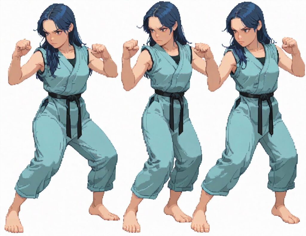 idle spr1t3, barefoot, 1girl, blue hair, long hair, multiple views, fighting stance, aqua dougi, black belt, simple background, white background ,masterpiece,best quality,amazing quality <lora:Idle_Sprite:1>