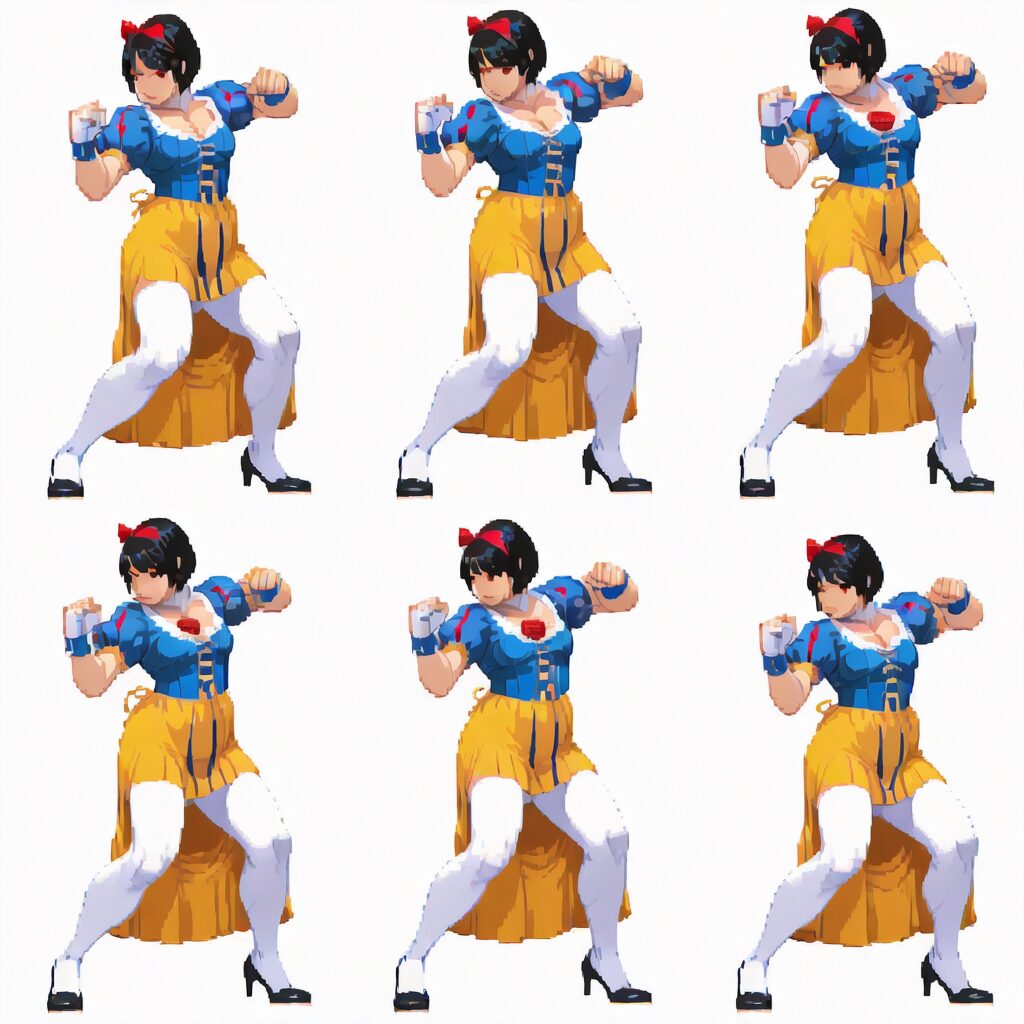 idle spr1t3, multiple views, short black bob haircut, blue top with puff sleeves, yellow skirt, white thigh-high stockings. 1girl, fighting stance, snow white, split dress, white stockings and suspenders, toned legs, blue bodice and a yellow skirt, high collar, red headband, bob cut, simple background, white background ,masterpiece,best quality,amazing quality<lora:Idle_Sprite:1>