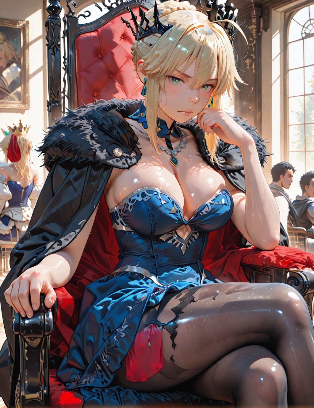breasts,crown, large breasts, sitting, artoria pendragon (lancer) (fate), 1girl, long hair, cape, green eyes, looking at viewer, blonde hair, thighs, cleavage, shiny skin, bangs, jewelry, crossed legs, earrings, fur trim, shiny, throne, dress, blue dress, hair between eyes, sidelocks, indoors, pantyhose, multiple boys, closed mouth, fur-trimmed cape, french braid, necklace, ahoge, chair, window, mordred (fate/apocrypha), solo focus, braid, detached collar, sweatdrop, NO_LORA
