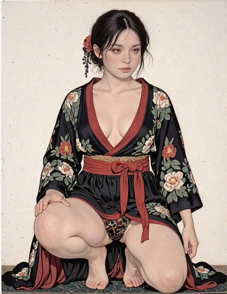 masterpiece, best quality, absurdres, Eugene-Delacroix, Kasumi from Dead or Alive in open shinobi robe with red sash, delicate curves, one knee down pose,, NO_LORA   ,fine art parody,
