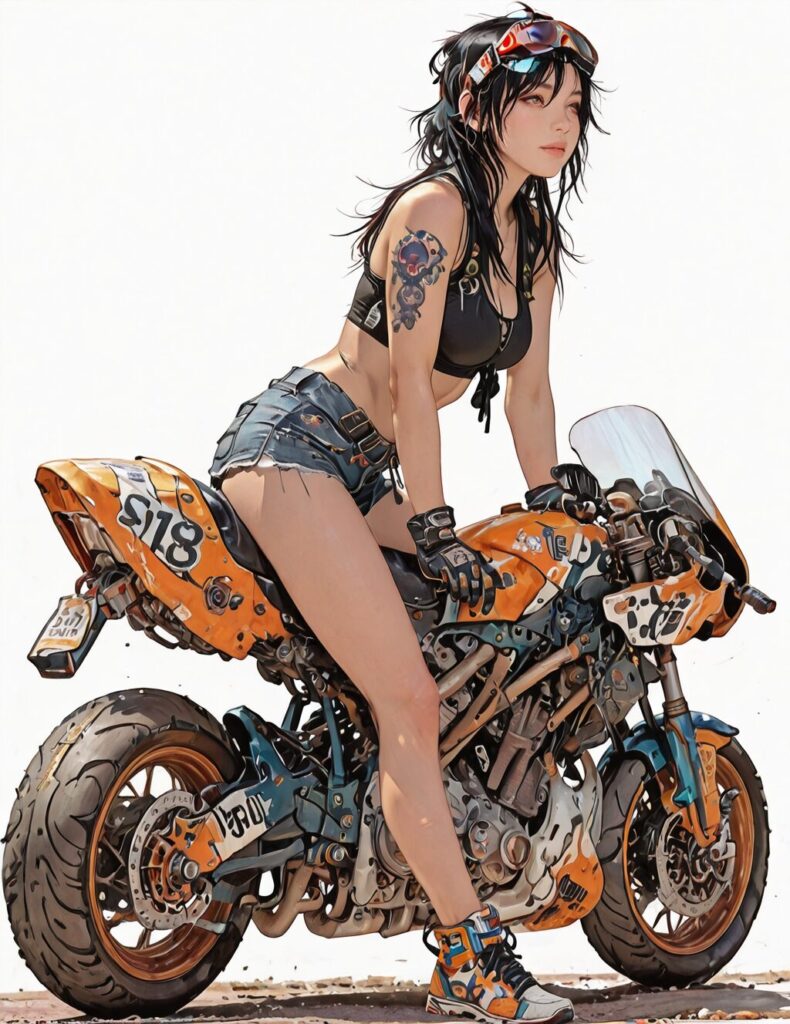 dtlcr2_stx, 1girl, solo, shorts, ground vehicle, motorcycle, motor vehicle, breasts, gloves, sneakers, shoes, NO_LORA