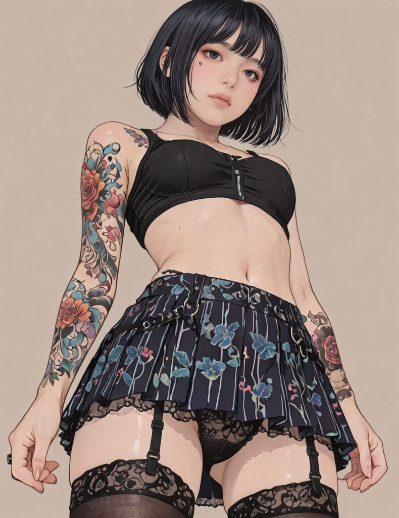 dtlcr2_stx, 1girl, solo, skirt, underwear, from below, panties, black hair, thighhighs, tattoo, short hair, NO_LORA